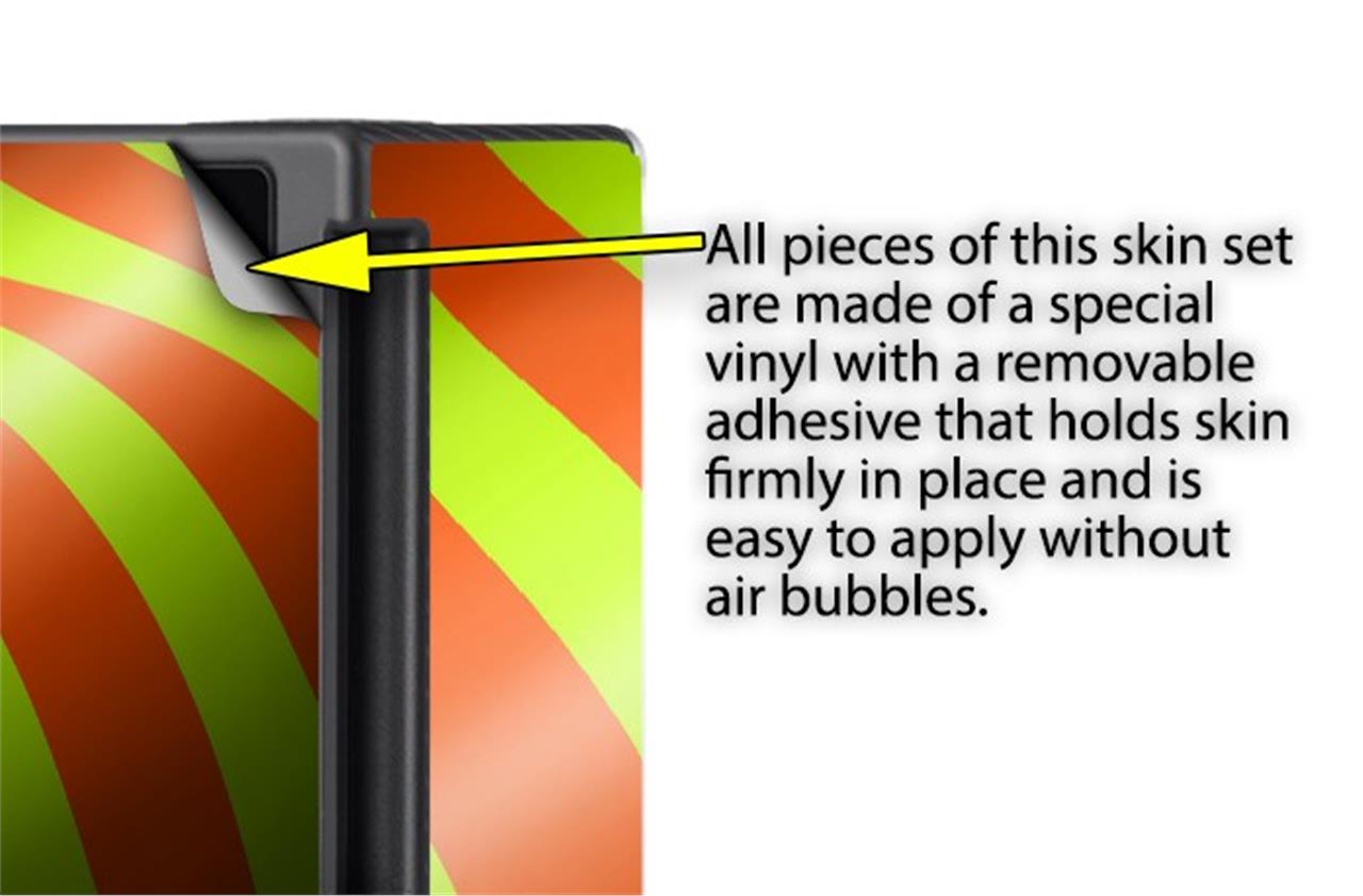 WraptorSkinz® skins are superb photo quality designs and vibrant colors printed with special Eco-Friendly, fade resistant inks. Our skins are self-adhering flexible vinyl skins that helps prevent scratches. Made of composite, multi-layered commercial grade materials. The bottom layer is made with a special removable adhesive that is easily positioned and applied without air bubbles. We print your design on the bottom layer then bond a professional grade laminate over the entire skin adding a glossy protective finish.