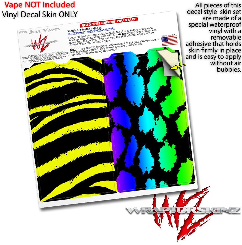 WraptorSkinz® skin wraps are printed using superb photo quality designs and vibrant colors printed with special fade resistant inks that last even in direct sun for years. WraptorSkinz are a composite of two layers of commercial grade materials. The bottom layer is a soft, flexible vinyl with a special removable adhesive that is easily positioned, applied without air bubbles. Next we print the bottom layer with UV protected, fade resistant inks that deliver superb photo quality designs in vibrant colors. Finally we bond a professional grade laminate over the entire skin adding a glossy protective finish. This product is not affiliated with or endorsed by the Juul brand.