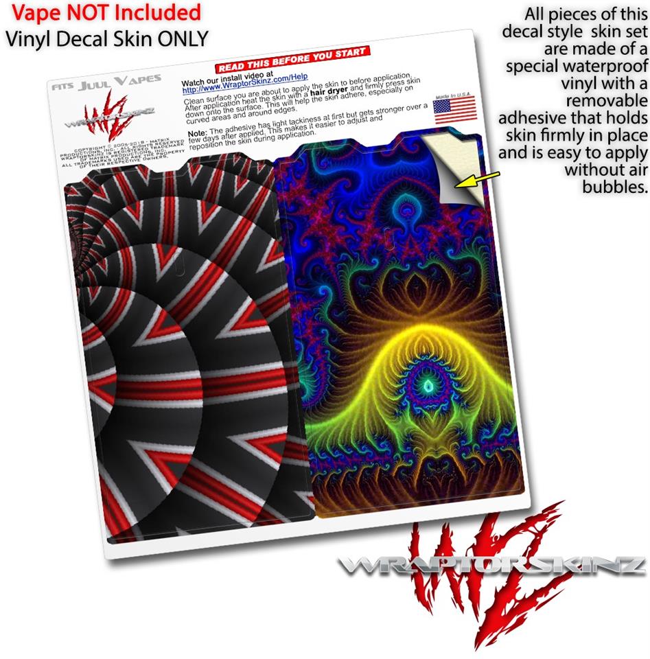 WraptorSkinz® skin wraps are printed using superb photo quality designs and vibrant colors printed with special fade resistant inks that last even in direct sun for years. WraptorSkinz are a composite of two layers of commercial grade materials. The bottom layer is a soft, flexible vinyl with a special removable adhesive that is easily positioned, applied without air bubbles. Next we print the bottom layer with UV protected, fade resistant inks that deliver superb photo quality designs in vibrant colors. Finally we bond a professional grade laminate over the entire skin adding a glossy protective finish. This product is not affiliated with or endorsed by the Juul brand.