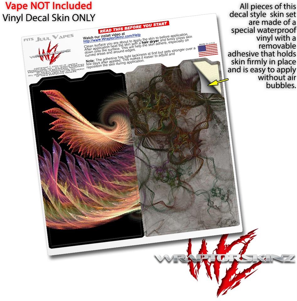 WraptorSkinz® skin wraps are printed using superb photo quality designs and vibrant colors printed with special fade resistant inks that last even in direct sun for years. WraptorSkinz are a composite of two layers of commercial grade materials. The bottom layer is a soft, flexible vinyl with a special removable adhesive that is easily positioned, applied without air bubbles. Next we print the bottom layer with UV protected, fade resistant inks that deliver superb photo quality designs in vibrant colors. Finally we bond a professional grade laminate over the entire skin adding a glossy protective finish. This product is not affiliated with or endorsed by the Juul brand.
