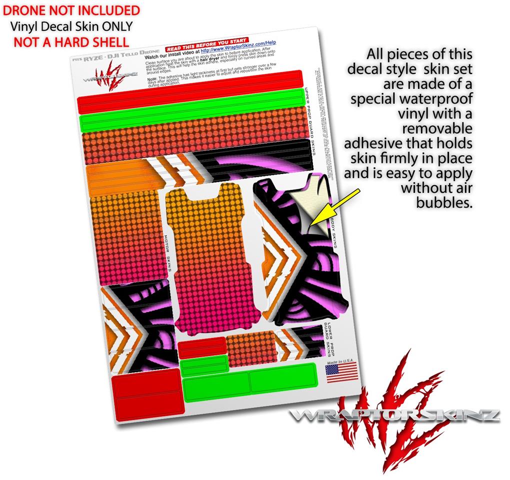 WraptorSkinz® skin wraps are printed using superb photo quality designs and vibrant colors printed with special fade resistant inks that last even in direct sun for years. WraptorSkinz are a composite of two layers of commercial grade materials. The bottom layer is a soft, flexible vinyl with a special removable adhesive that is easily positioned, applied without air bubbles. Next we print the bottom layer with UV protected, fade resistant inks that deliver superb photo quality designs in vibrant colors. Finally we bond a professional grade laminate over the entire skin adding a glossy protective finish. This product is not affiliated with or endorsed by the Ryze or DJI brand.