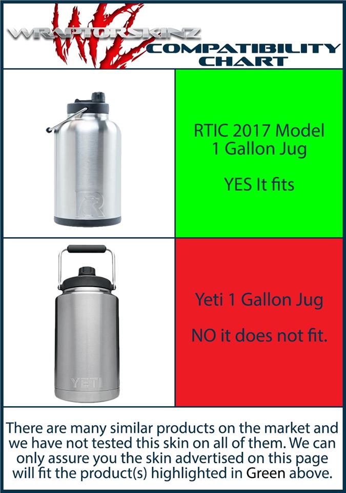 WraptorSkinz® skin wraps for RTIC One Gallon Jugs are printed using superb photo quality designs and vibrant colors printed with special fade resistant inks that last even in direct sun for years. WraptorSkinz are a composite of two layers of commercial grade materials. The bottom layer is a soft, flexible vinyl with a special removable adhesive that is easily positioned, applied without air bubbles. Next, we print the bottom layer with UV protected, fade resistant inks that deliver superb photo quality designs in vibrant colors. Finally, we bond a professional grade laminate over the entire skin adding a glossy protective finish.