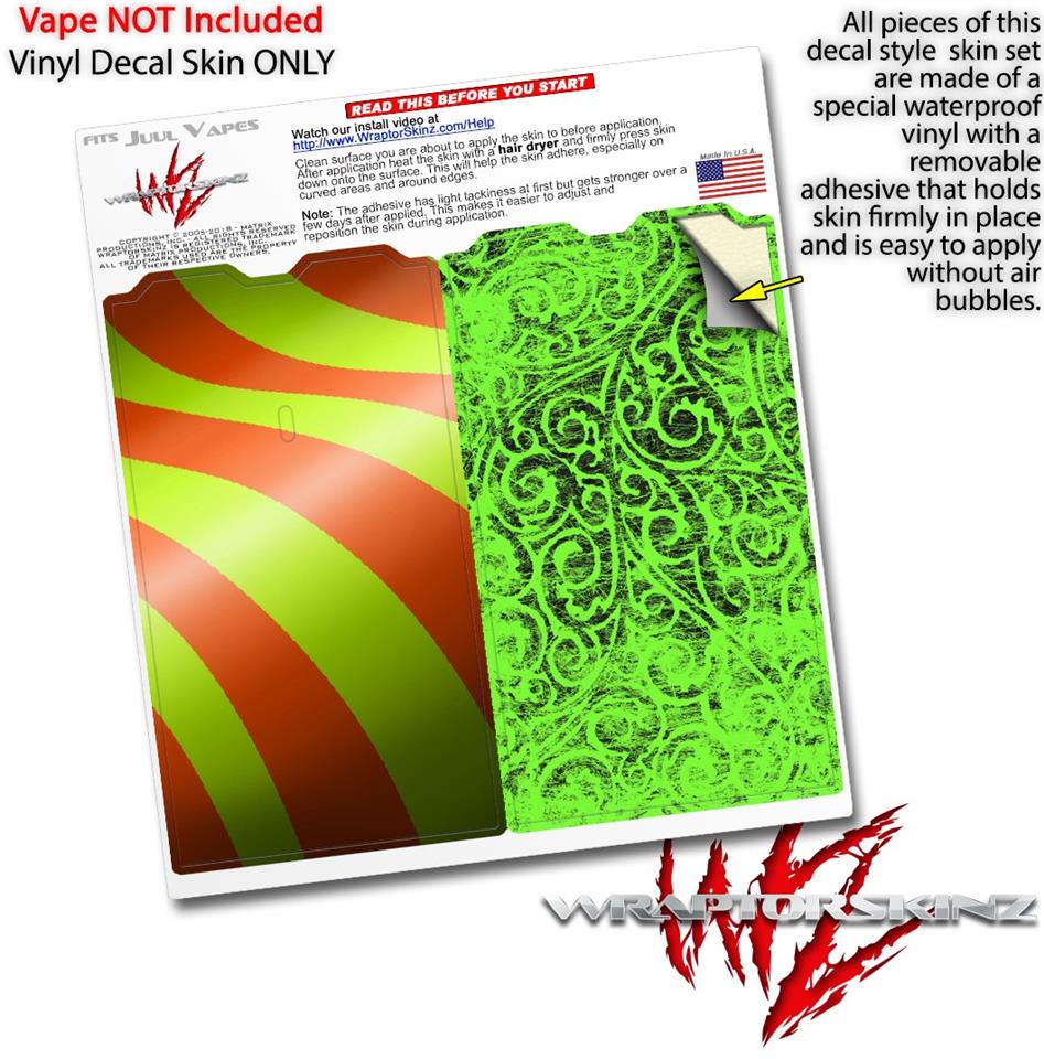 WraptorSkinz® skin wraps are printed using superb photo quality designs and vibrant colors printed with special fade resistant inks that last even in direct sun for years. WraptorSkinz are a composite of two layers of commercial grade materials. The bottom layer is a soft, flexible vinyl with a special removable adhesive that is easily positioned, applied without air bubbles. Next we print the bottom layer with UV protected, fade resistant inks that deliver superb photo quality designs in vibrant colors. Finally we bond a professional grade laminate over the entire skin adding a glossy protective finish. This product is not affiliated with or endorsed by the Juul brand.
