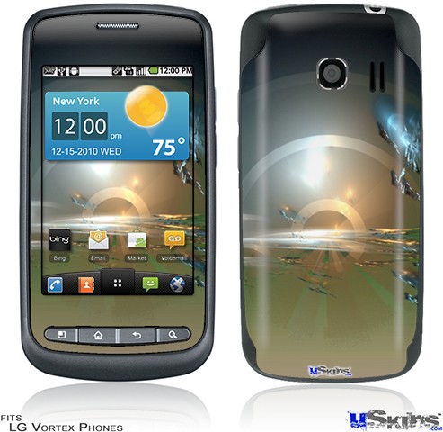 Skin covers front and back of LG Vortex cell phone.