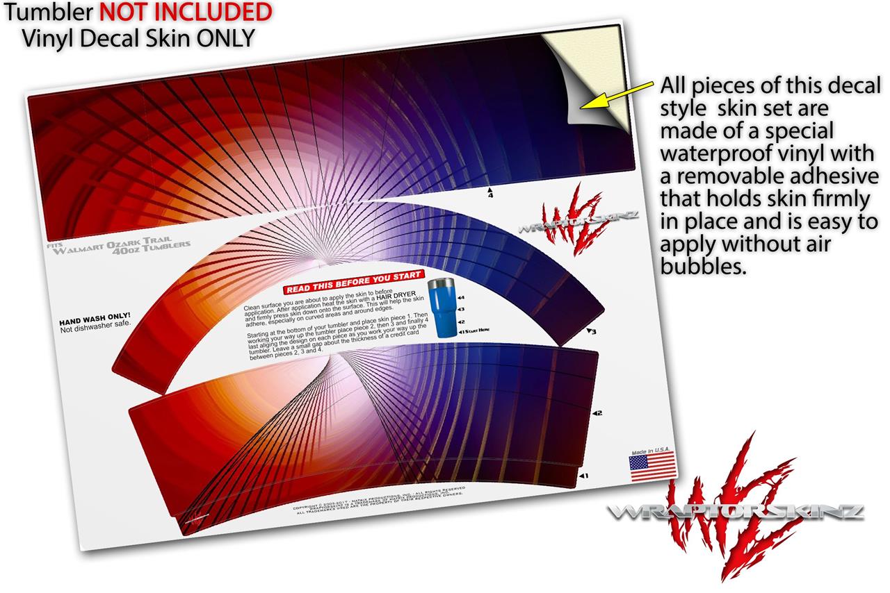 WraptorSkinz® skin wraps for Walmart Ozark Trail Tumblers are printed using superb photo quality designs and vibrant colors printed with special fade resistant inks that last even in direct sun for years. WraptorSkinz® are a composite of two layers of commercial grade materials. The bottom layer is a soft, flexible vinyl with a special removable adhesive that is easily positioned, applied without air bubbles. Next we print the bottom layer with UV protected, fade resistant inks that deliver superb photo quality designs in vibrant colors. Finally we bond a professional grade laminate over the entire skin adding a glossy protective finish.