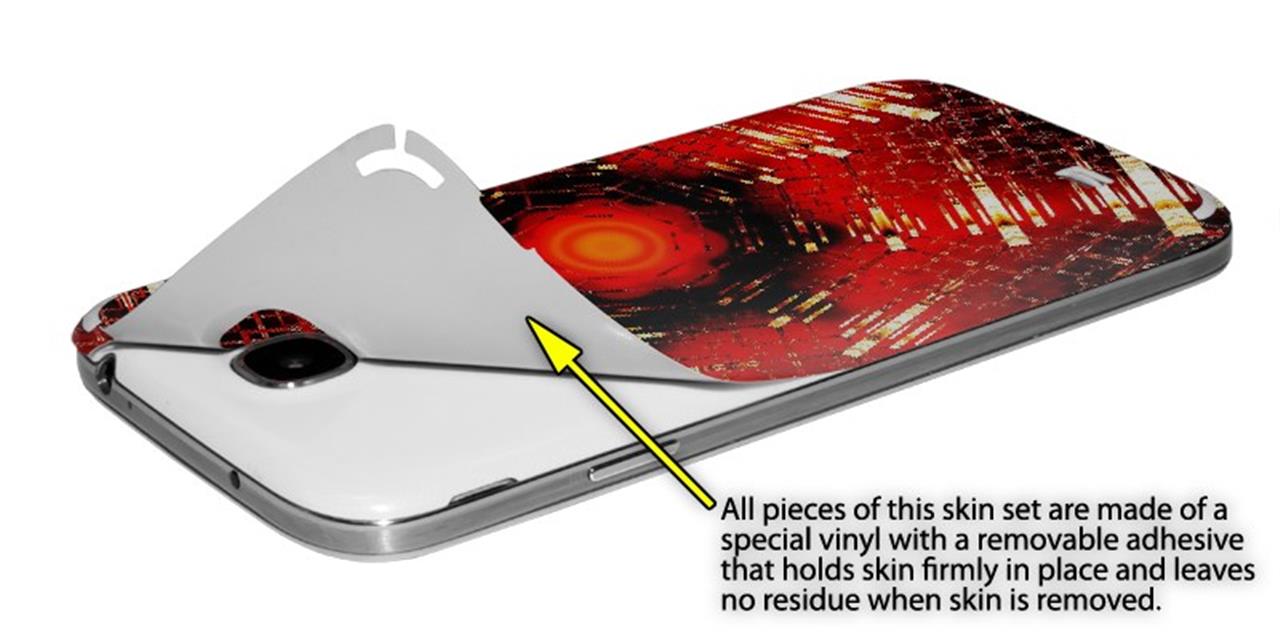 • Decal style vinyl skin covers front and back of Samsung Galaxy S4 phone.