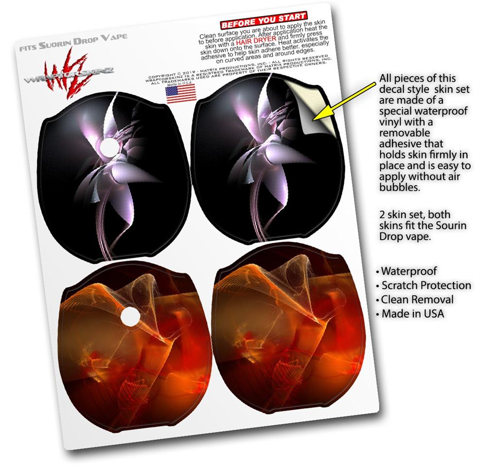 WraptorSkinz® skin wraps compatible with Suorin Drop Vape are printed using superb photo quality designs and vibrant colors printed with special fade resistant inks that last even in direct sun for years. WraptorSkinz are a composite of two layers of commercial grade materials. The bottom layer is a soft, flexible vinyl with a special removable adhesive that is easily positioned, applied without air bubbles. Next, we print the bottom layer with UV protected, fade resistant inks that deliver superb photo quality designs in vibrant colors. Finally, we bond a professional grade laminate over the entire skin adding a glossy protective finish. This product is not affiliated with or endorsed by Suorin.