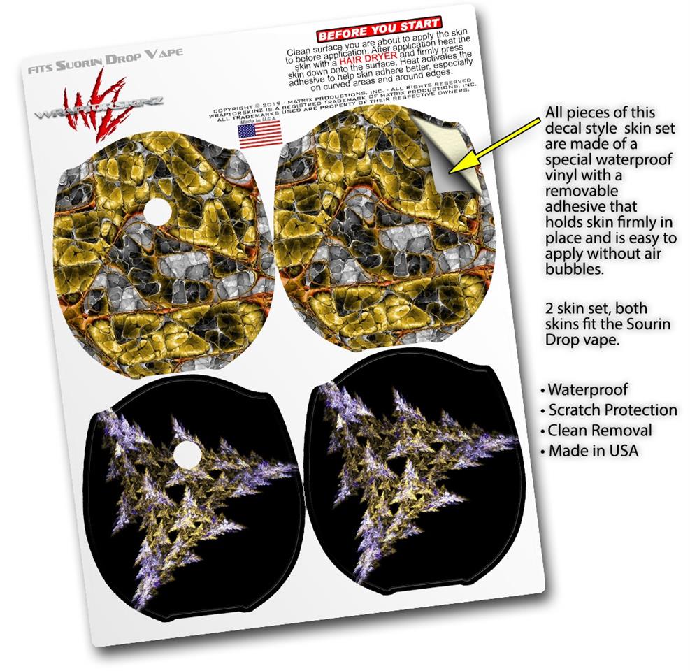 WraptorSkinz® skin wraps compatible with Suorin Drop Vape are printed using superb photo quality designs and vibrant colors printed with special fade resistant inks that last even in direct sun for years. WraptorSkinz are a composite of two layers of commercial grade materials. The bottom layer is a soft, flexible vinyl with a special removable adhesive that is easily positioned, applied without air bubbles. Next, we print the bottom layer with UV protected, fade resistant inks that deliver superb photo quality designs in vibrant colors. Finally, we bond a professional grade laminate over the entire skin adding a glossy protective finish. This product is not affiliated with or endorsed by Suorin.