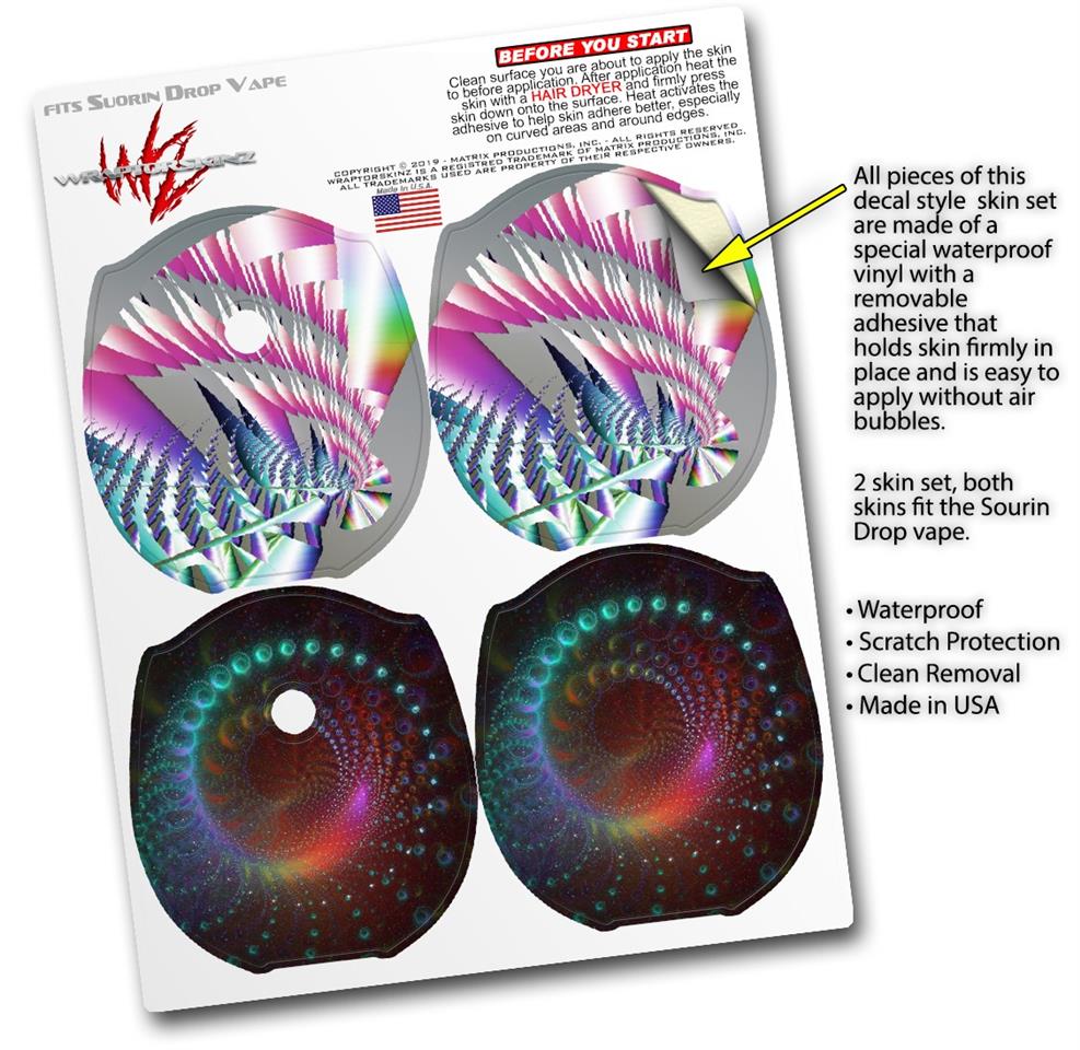WraptorSkinz® skin wraps compatible with Suorin Drop Vape are printed using superb photo quality designs and vibrant colors printed with special fade resistant inks that last even in direct sun for years. WraptorSkinz are a composite of two layers of commercial grade materials. The bottom layer is a soft, flexible vinyl with a special removable adhesive that is easily positioned, applied without air bubbles. Next, we print the bottom layer with UV protected, fade resistant inks that deliver superb photo quality designs in vibrant colors. Finally, we bond a professional grade laminate over the entire skin adding a glossy protective finish. This product is not affiliated with or endorsed by Suorin.