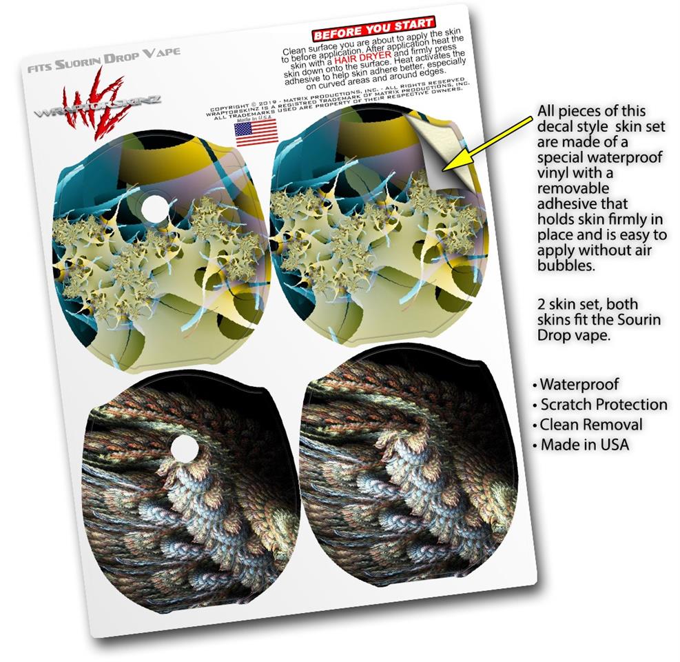 WraptorSkinz® skin wraps compatible with Suorin Drop Vape are printed using superb photo quality designs and vibrant colors printed with special fade resistant inks that last even in direct sun for years. WraptorSkinz are a composite of two layers of commercial grade materials. The bottom layer is a soft, flexible vinyl with a special removable adhesive that is easily positioned, applied without air bubbles. Next, we print the bottom layer with UV protected, fade resistant inks that deliver superb photo quality designs in vibrant colors. Finally, we bond a professional grade laminate over the entire skin adding a glossy protective finish. This product is not affiliated with or endorsed by Suorin.