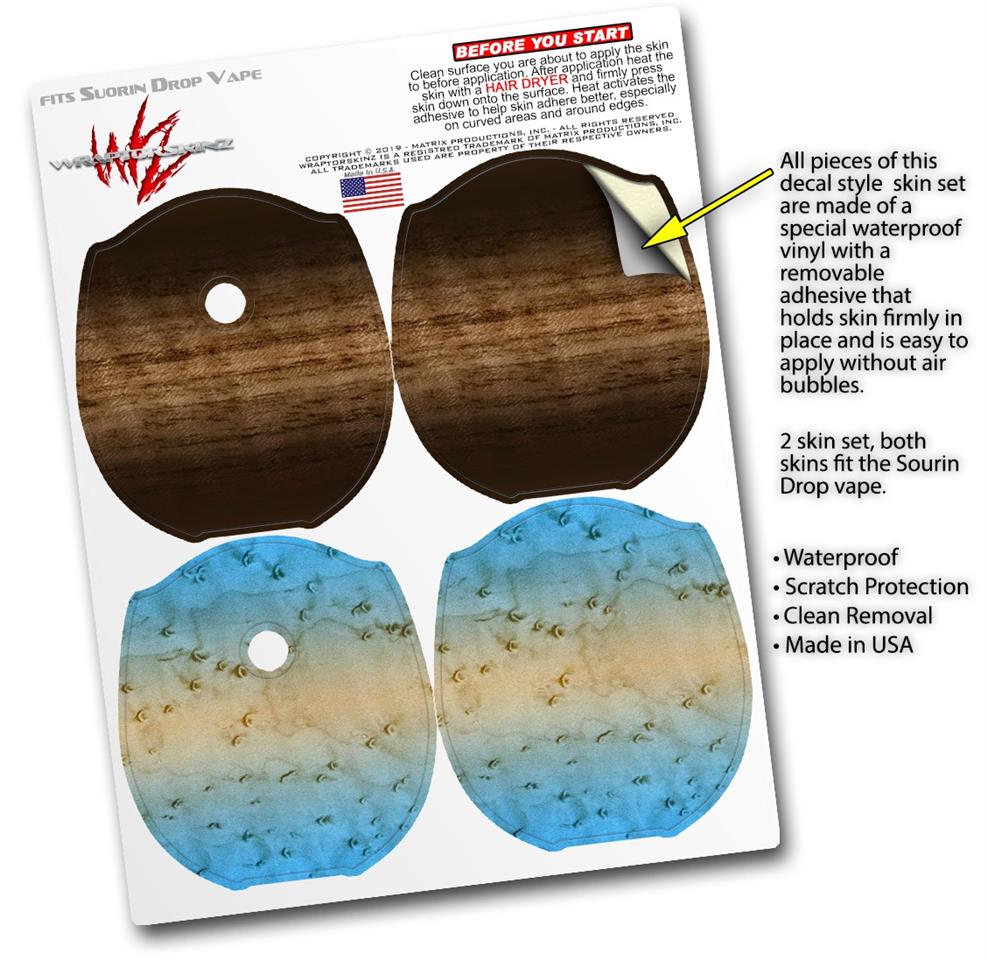 WraptorSkinz® skin wraps compatible with Suorin Drop Vape are printed using superb photo quality designs and vibrant colors printed with special fade resistant inks that last even in direct sun for years. WraptorSkinz are a composite of two layers of commercial grade materials. The bottom layer is a soft, flexible vinyl with a special removable adhesive that is easily positioned, applied without air bubbles. Next, we print the bottom layer with UV protected, fade resistant inks that deliver superb photo quality designs in vibrant colors. Finally, we bond a professional grade laminate over the entire skin adding a glossy protective finish. This product is not affiliated with or endorsed by Suorin.