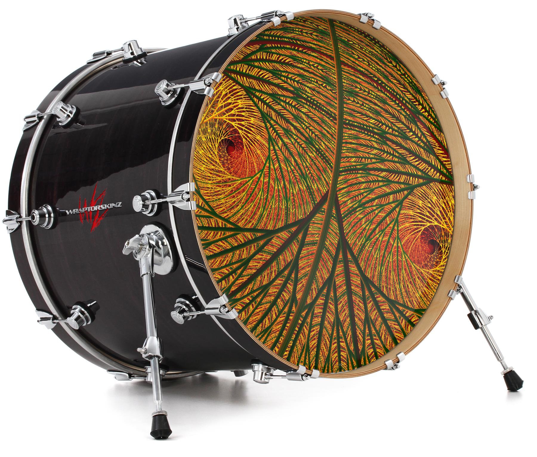 This design also available in other sizes. WraptorSkinz® skin wraps compatible with most kick drum heads. Printed using superb photo quality designs and vibrant colors printed with special fade resistant inks that last even in direct sun for years. WraptorSkinz are a composite three layer commercial grade materials vinyl. The bottom layer is a air release, grey block out removable adhesive that hides existing graphics on the drum head and is easily applied without air bubbles. The middle layer is a flexible vinyl printed with UV protected, fade resistant inks that deliver superb photo quality designs in vibrant colors. Finally, we bond a professional grade laminate over the entire skin adding a glossy protective finish.