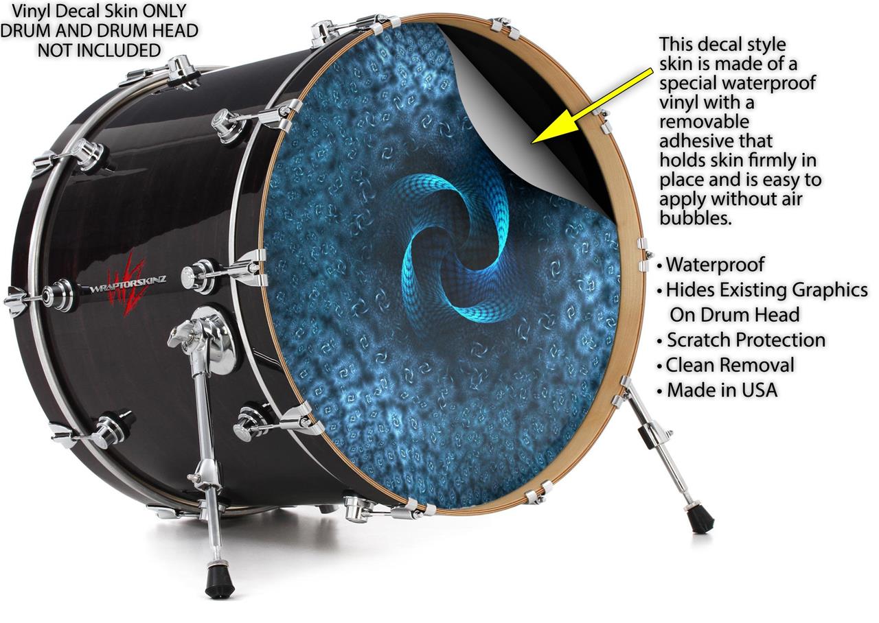 This design also available in other sizes. WraptorSkinz® skin wraps compatible with most kick drum heads. Printed using superb photo quality designs and vibrant colors printed with special fade resistant inks that last even in direct sun for years. WraptorSkinz are a composite three layer commercial grade materials vinyl. The bottom layer is a air release, grey block out removable adhesive that hides existing graphics on the drum head and is easily applied without air bubbles. The middle layer is a flexible vinyl printed with UV protected, fade resistant inks that deliver superb photo quality designs in vibrant colors. Finally, we bond a professional grade laminate over the entire skin adding a glossy protective finish.