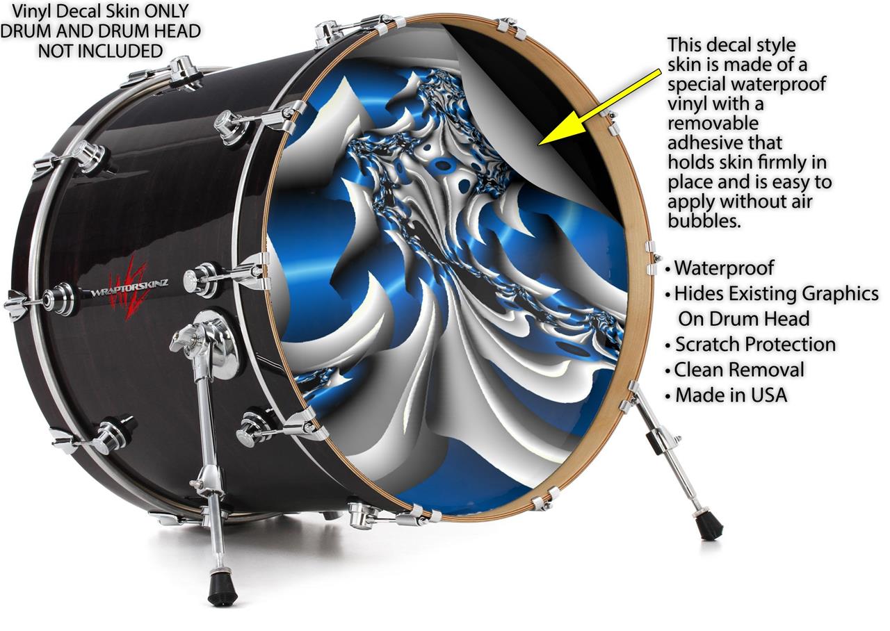 This design also available in other sizes. WraptorSkinz® skin wraps compatible with most kick drum heads. Printed using superb photo quality designs and vibrant colors printed with special fade resistant inks that last even in direct sun for years. WraptorSkinz are a composite three layer commercial grade materials vinyl. The bottom layer is a air release, grey block out removable adhesive that hides existing graphics on the drum head and is easily applied without air bubbles. The middle layer is a flexible vinyl printed with UV protected, fade resistant inks that deliver superb photo quality designs in vibrant colors. Finally, we bond a professional grade laminate over the entire skin adding a glossy protective finish.