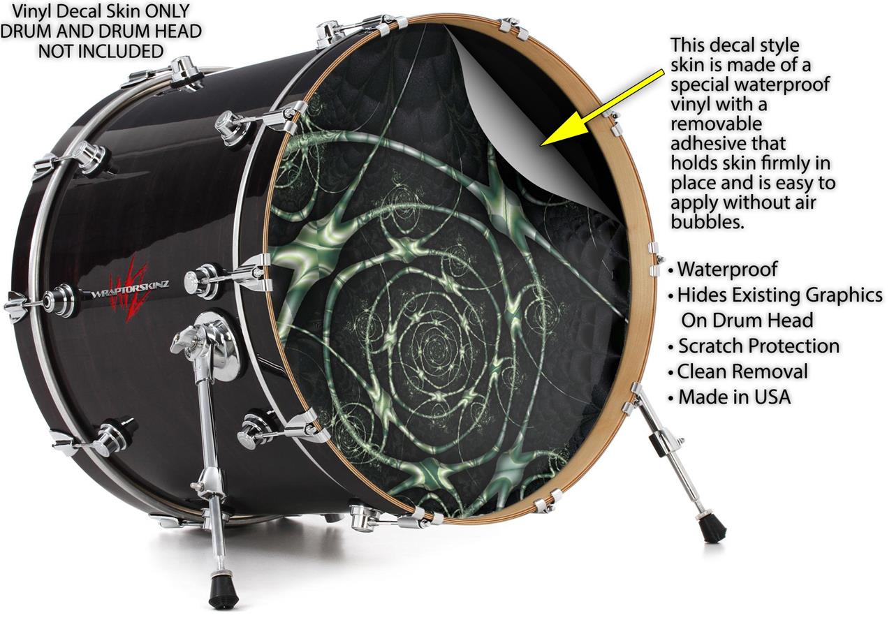 This design also available in other sizes. WraptorSkinz® skin wraps compatible with most kick drum heads. Printed using superb photo quality designs and vibrant colors printed with special fade resistant inks that last even in direct sun for years. WraptorSkinz are a composite three layer commercial grade materials vinyl. The bottom layer is a air release, grey block out removable adhesive that hides existing graphics on the drum head and is easily applied without air bubbles. The middle layer is a flexible vinyl printed with UV protected, fade resistant inks that deliver superb photo quality designs in vibrant colors. Finally, we bond a professional grade laminate over the entire skin adding a glossy protective finish.