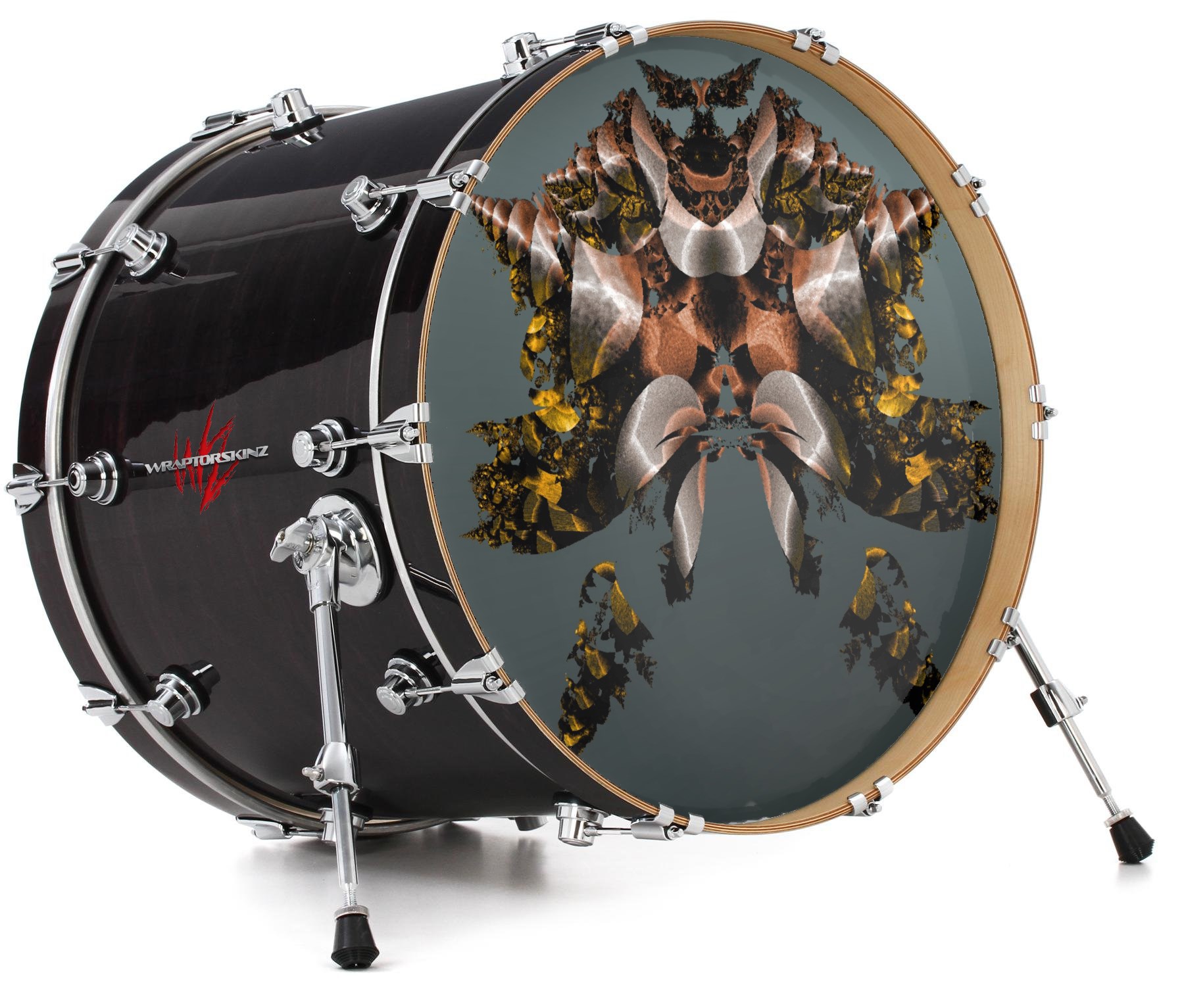 This design also available in other sizes. WraptorSkinz® skin wraps compatible with most kick drum heads. Printed using superb photo quality designs and vibrant colors printed with special fade resistant inks that last even in direct sun for years. WraptorSkinz are a composite three layer commercial grade materials vinyl. The bottom layer is a air release, grey block out removable adhesive that hides existing graphics on the drum head and is easily applied without air bubbles. The middle layer is a flexible vinyl printed with UV protected, fade resistant inks that deliver superb photo quality designs in vibrant colors. Finally, we bond a professional grade laminate over the entire skin adding a glossy protective finish.