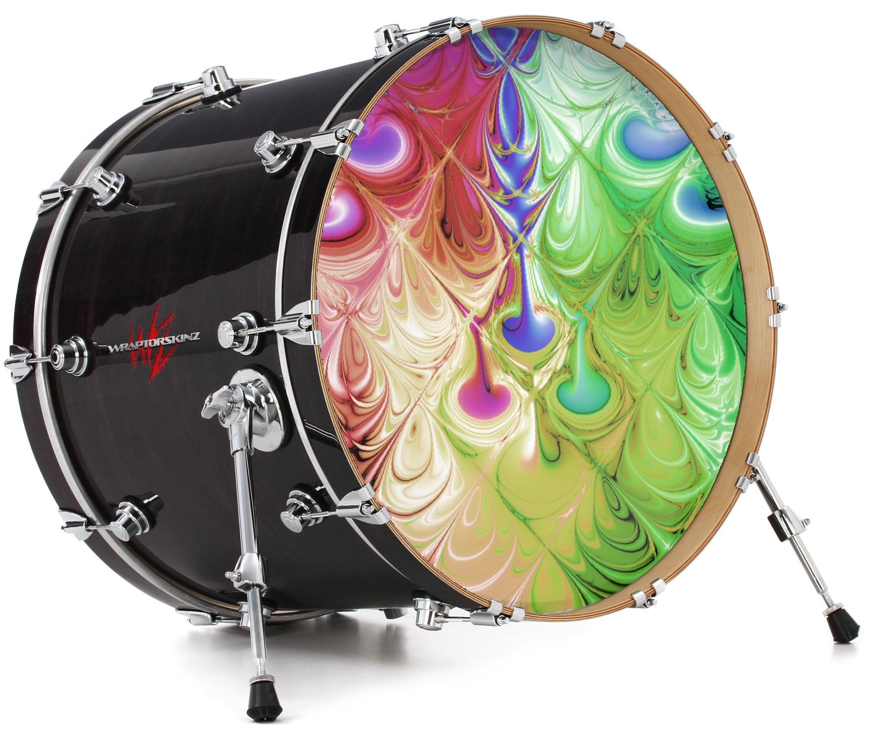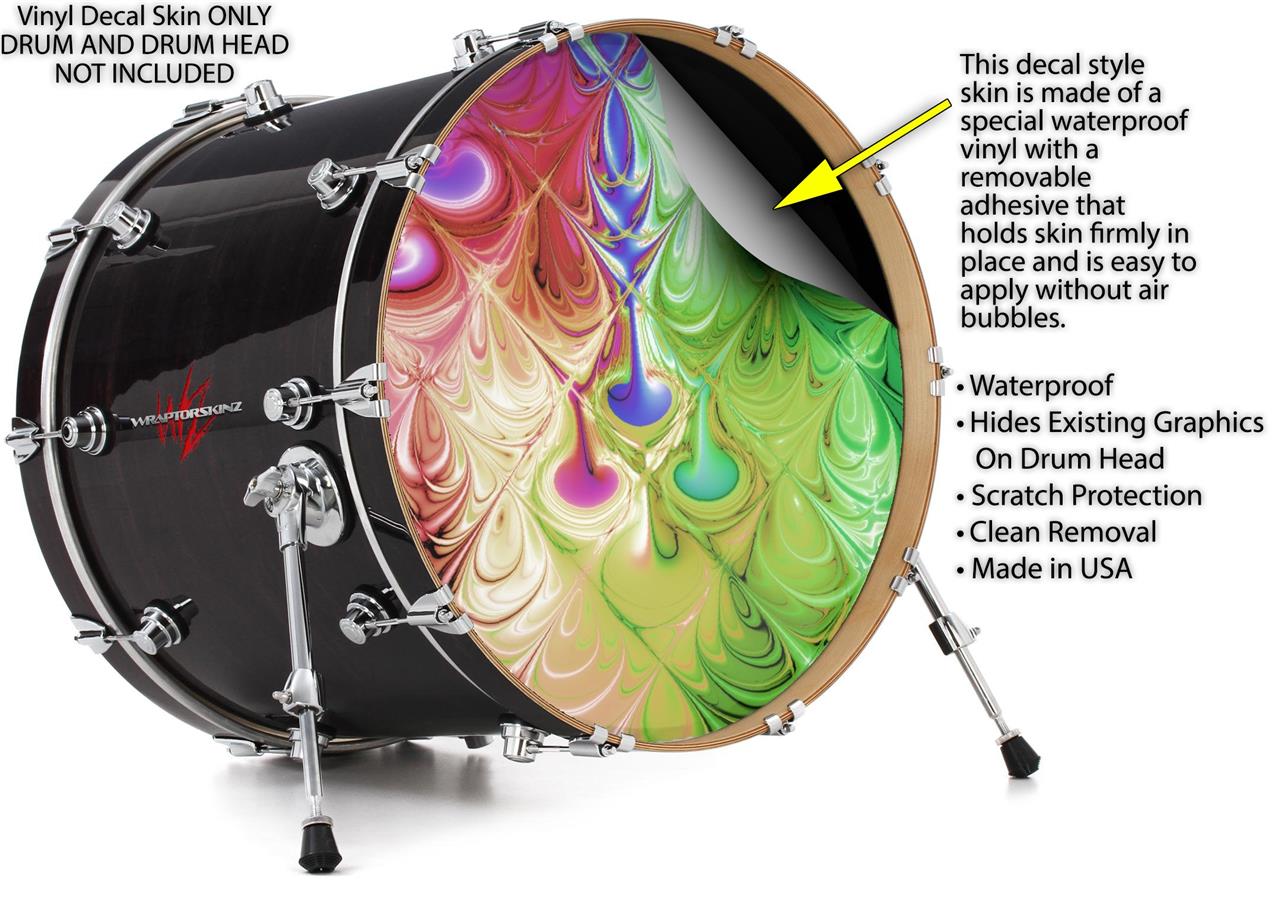 This design also available in other sizes. WraptorSkinz® skin wraps compatible with most kick drum heads. Printed using superb photo quality designs and vibrant colors printed with special fade resistant inks that last even in direct sun for years. WraptorSkinz are a composite three layer commercial grade materials vinyl. The bottom layer is a air release, grey block out removable adhesive that hides existing graphics on the drum head and is easily applied without air bubbles. The middle layer is a flexible vinyl printed with UV protected, fade resistant inks that deliver superb photo quality designs in vibrant colors. Finally, we bond a professional grade laminate over the entire skin adding a glossy protective finish.