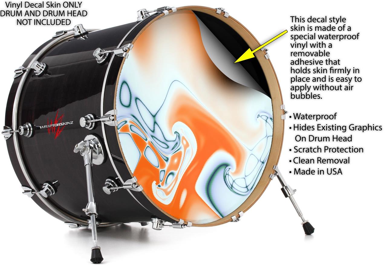 This design also available in other sizes. WraptorSkinz® skin wraps compatible with most kick drum heads. Printed using superb photo quality designs and vibrant colors printed with special fade resistant inks that last even in direct sun for years. WraptorSkinz are a composite three layer commercial grade materials vinyl. The bottom layer is a air release, grey block out removable adhesive that hides existing graphics on the drum head and is easily applied without air bubbles. The middle layer is a flexible vinyl printed with UV protected, fade resistant inks that deliver superb photo quality designs in vibrant colors. Finally, we bond a professional grade laminate over the entire skin adding a glossy protective finish.