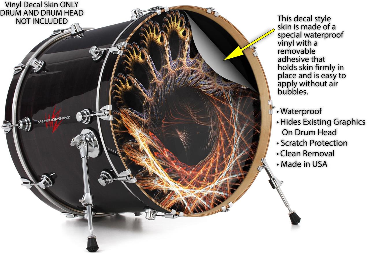 This design also available in other sizes. WraptorSkinz® skin wraps compatible with most kick drum heads. Printed using superb photo quality designs and vibrant colors printed with special fade resistant inks that last even in direct sun for years. WraptorSkinz are a composite three layer commercial grade materials vinyl. The bottom layer is a air release, grey block out removable adhesive that hides existing graphics on the drum head and is easily applied without air bubbles. The middle layer is a flexible vinyl printed with UV protected, fade resistant inks that deliver superb photo quality designs in vibrant colors. Finally, we bond a professional grade laminate over the entire skin adding a glossy protective finish.