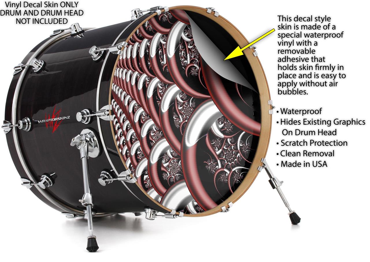 This design also available in other sizes. WraptorSkinz® skin wraps compatible with most kick drum heads. Printed using superb photo quality designs and vibrant colors printed with special fade resistant inks that last even in direct sun for years. WraptorSkinz are a composite three layer commercial grade materials vinyl. The bottom layer is a air release, grey block out removable adhesive that hides existing graphics on the drum head and is easily applied without air bubbles. The middle layer is a flexible vinyl printed with UV protected, fade resistant inks that deliver superb photo quality designs in vibrant colors. Finally, we bond a professional grade laminate over the entire skin adding a glossy protective finish.