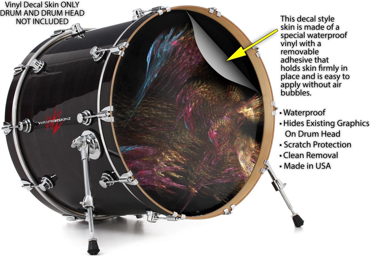 This design also available in other sizes. WraptorSkinz® skin wraps compatible with most kick drum heads. Printed using superb photo quality designs and vibrant colors printed with special fade resistant inks that last even in direct sun for years. WraptorSkinz are a composite three layer commercial grade materials vinyl. The bottom layer is a air release, grey block out removable adhesive that hides existing graphics on the drum head and is easily applied without air bubbles. The middle layer is a flexible vinyl printed with UV protected, fade resistant inks that deliver superb photo quality designs in vibrant colors. Finally, we bond a professional grade laminate over the entire skin adding a glossy protective finish.