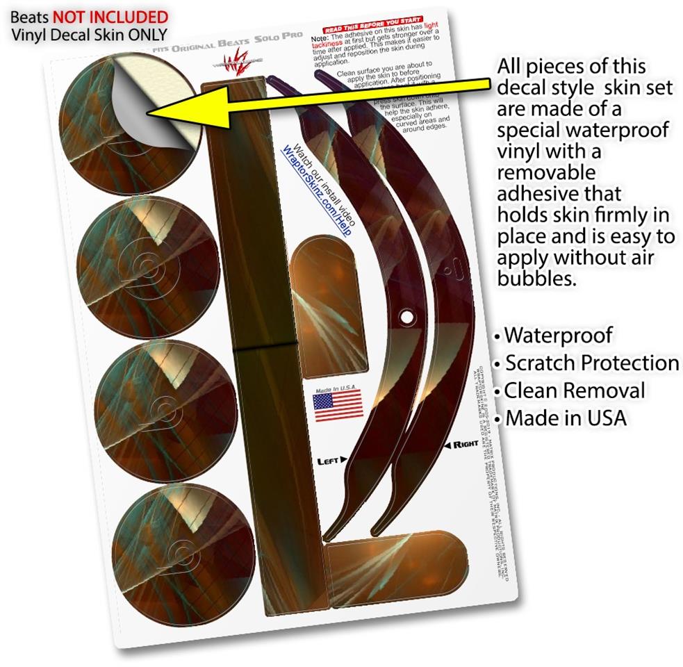 This product is in no way affiliated with or endorsed by Apple or Beats brand products. WraptorSkinz® skin wraps work with the Original Beats Solo Pro version 1 headphones. Printed using superb photo quality designs and vibrant colors printed with special fade resistant inks that last even in direct sun for years. WraptorSkinz are a composite of two layers of commercial grade materials. The bottom layer is a soft, flexible vinyl with a special removable adhesive that is easily positioned, applied without air bubbles. Next, we print the bottom layer with UV protected, fade resistant inks that deliver superb photo quality designs in vibrant colors. Finally, we bond a professional grade laminate over the entire skin adding a glossy protective finish.