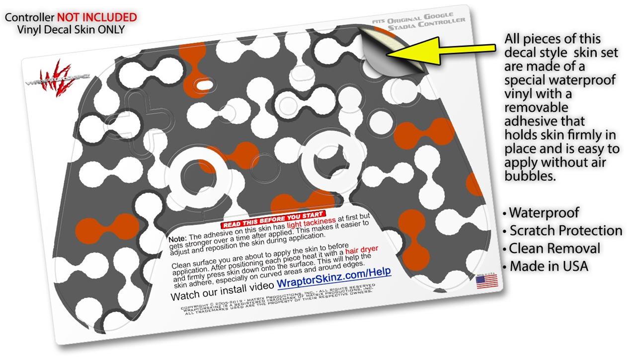 This product is in no way affiliated with or endorsed by Google. WraptorSkinz® skin wraps work with the Original Google Stadia version 1 Controller. Printed using superb photo quality designs and vibrant colors printed with special fade resistant inks that last even in direct sun for years. WraptorSkinz are a composite of two layers of commercial grade materials. The bottom layer is a soft, flexible vinyl with a special removable adhesive that is easily positioned, applied without air bubbles. Next, we print the bottom layer with UV protected, fade resistant inks that deliver superb photo quality designs in vibrant colors. Finally, we bond a professional grade laminate over the entire skin adding a glossy protective finish.
