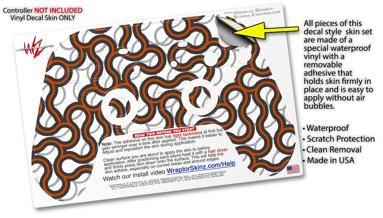 This product is in no way affiliated with or endorsed by Google. WraptorSkinz® skin wraps work with the Original Google Stadia version 1 Controller. Printed using superb photo quality designs and vibrant colors printed with special fade resistant inks that last even in direct sun for years. WraptorSkinz are a composite of two layers of commercial grade materials. The bottom layer is a soft, flexible vinyl with a special removable adhesive that is easily positioned, applied without air bubbles. Next, we print the bottom layer with UV protected, fade resistant inks that deliver superb photo quality designs in vibrant colors. Finally, we bond a professional grade laminate over the entire skin adding a glossy protective finish.