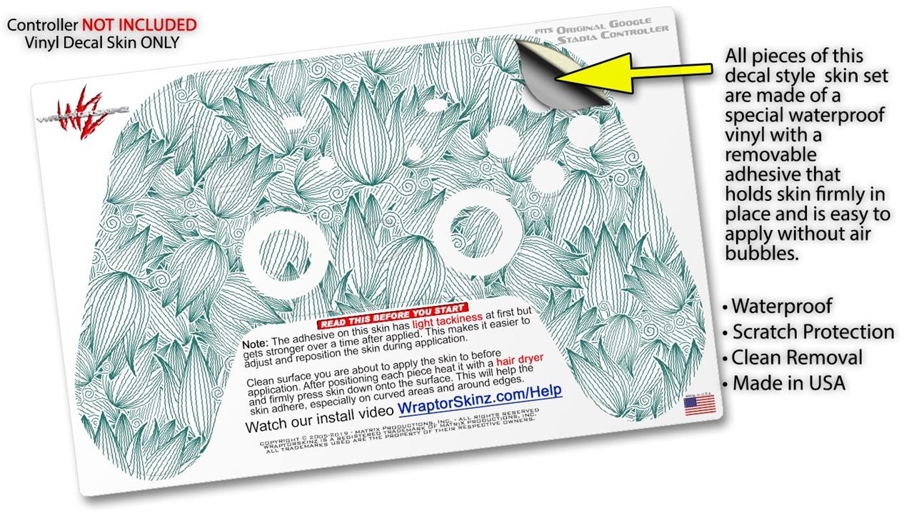 This product is in no way affiliated with or endorsed by Google. WraptorSkinz® skin wraps work with the Original Google Stadia version 1 Controller. Printed using superb photo quality designs and vibrant colors printed with special fade resistant inks that last even in direct sun for years. WraptorSkinz are a composite of two layers of commercial grade materials. The bottom layer is a soft, flexible vinyl with a special removable adhesive that is easily positioned, applied without air bubbles. Next, we print the bottom layer with UV protected, fade resistant inks that deliver superb photo quality designs in vibrant colors. Finally, we bond a professional grade laminate over the entire skin adding a glossy protective finish.