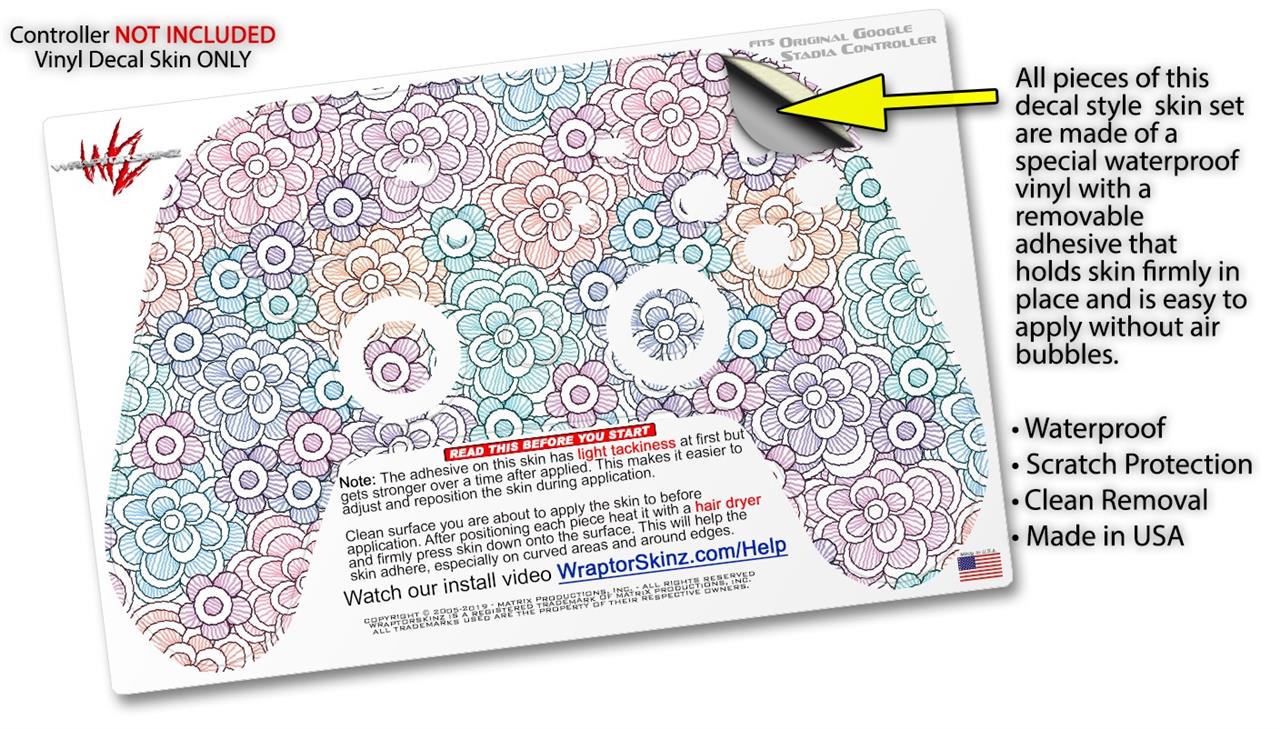 This product is in no way affiliated with or endorsed by Google. WraptorSkinz® skin wraps work with the Original Google Stadia version 1 Controller. Printed using superb photo quality designs and vibrant colors printed with special fade resistant inks that last even in direct sun for years. WraptorSkinz are a composite of two layers of commercial grade materials. The bottom layer is a soft, flexible vinyl with a special removable adhesive that is easily positioned, applied without air bubbles. Next, we print the bottom layer with UV protected, fade resistant inks that deliver superb photo quality designs in vibrant colors. Finally, we bond a professional grade laminate over the entire skin adding a glossy protective finish.