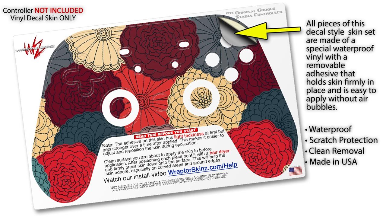 This product is in no way affiliated with or endorsed by Google. WraptorSkinz® skin wraps work with the Original Google Stadia version 1 Controller. Printed using superb photo quality designs and vibrant colors printed with special fade resistant inks that last even in direct sun for years. WraptorSkinz are a composite of two layers of commercial grade materials. The bottom layer is a soft, flexible vinyl with a special removable adhesive that is easily positioned, applied without air bubbles. Next, we print the bottom layer with UV protected, fade resistant inks that deliver superb photo quality designs in vibrant colors. Finally, we bond a professional grade laminate over the entire skin adding a glossy protective finish.