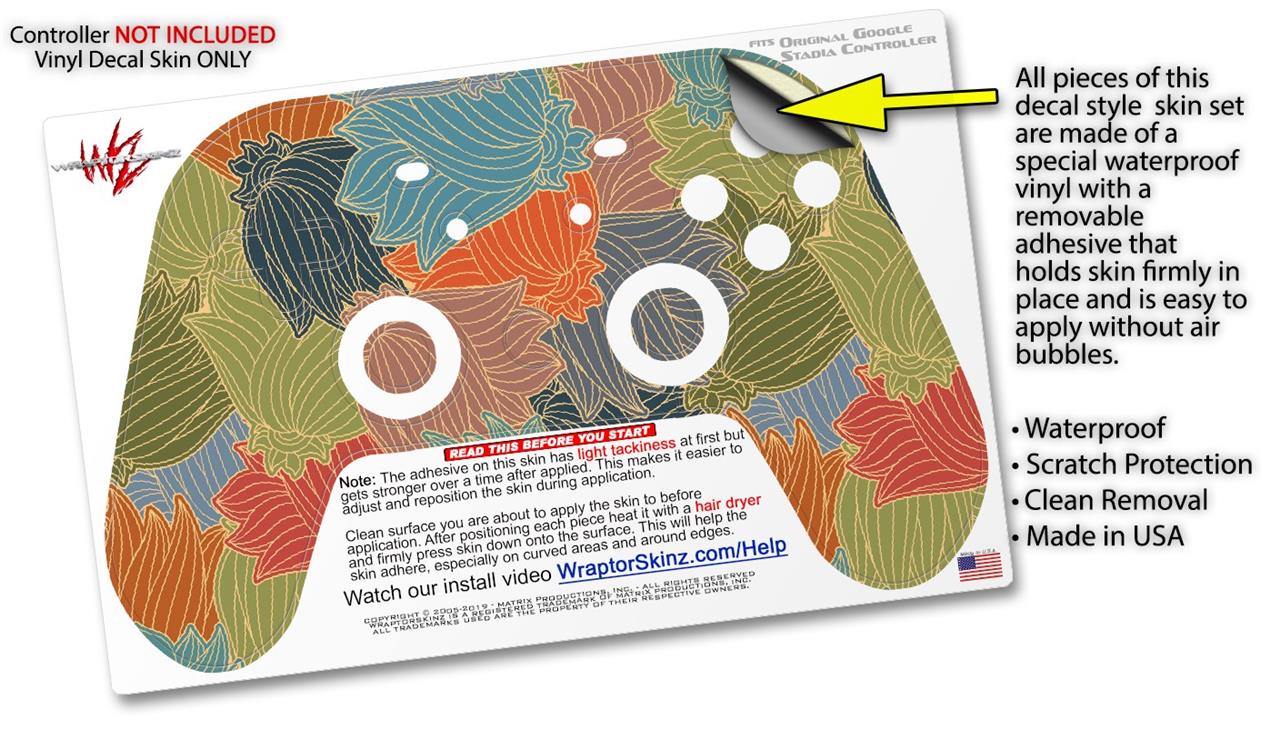 This product is in no way affiliated with or endorsed by Google. WraptorSkinz® skin wraps work with the Original Google Stadia version 1 Controller. Printed using superb photo quality designs and vibrant colors printed with special fade resistant inks that last even in direct sun for years. WraptorSkinz are a composite of two layers of commercial grade materials. The bottom layer is a soft, flexible vinyl with a special removable adhesive that is easily positioned, applied without air bubbles. Next, we print the bottom layer with UV protected, fade resistant inks that deliver superb photo quality designs in vibrant colors. Finally, we bond a professional grade laminate over the entire skin adding a glossy protective finish.