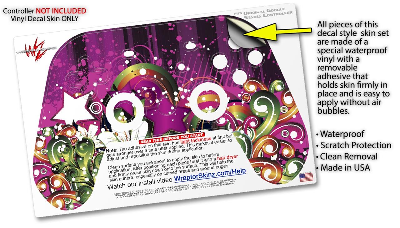 This product is in no way affiliated with or endorsed by Google. WraptorSkinz® skin wraps work with the Original Google Stadia version 1 Controller. Printed using superb photo quality designs and vibrant colors printed with special fade resistant inks that last even in direct sun for years. WraptorSkinz are a composite of two layers of commercial grade materials. The bottom layer is a soft, flexible vinyl with a special removable adhesive that is easily positioned, applied without air bubbles. Next, we print the bottom layer with UV protected, fade resistant inks that deliver superb photo quality designs in vibrant colors. Finally, we bond a professional grade laminate over the entire skin adding a glossy protective finish.