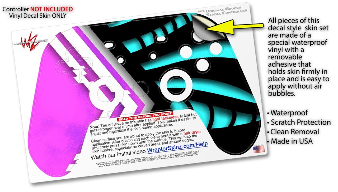This product is in no way affiliated with or endorsed by Google. WraptorSkinz® skin wraps work with the Original Google Stadia version 1 Controller. Printed using superb photo quality designs and vibrant colors printed with special fade resistant inks that last even in direct sun for years. WraptorSkinz are a composite of two layers of commercial grade materials. The bottom layer is a soft, flexible vinyl with a special removable adhesive that is easily positioned, applied without air bubbles. Next, we print the bottom layer with UV protected, fade resistant inks that deliver superb photo quality designs in vibrant colors. Finally, we bond a professional grade laminate over the entire skin adding a glossy protective finish.