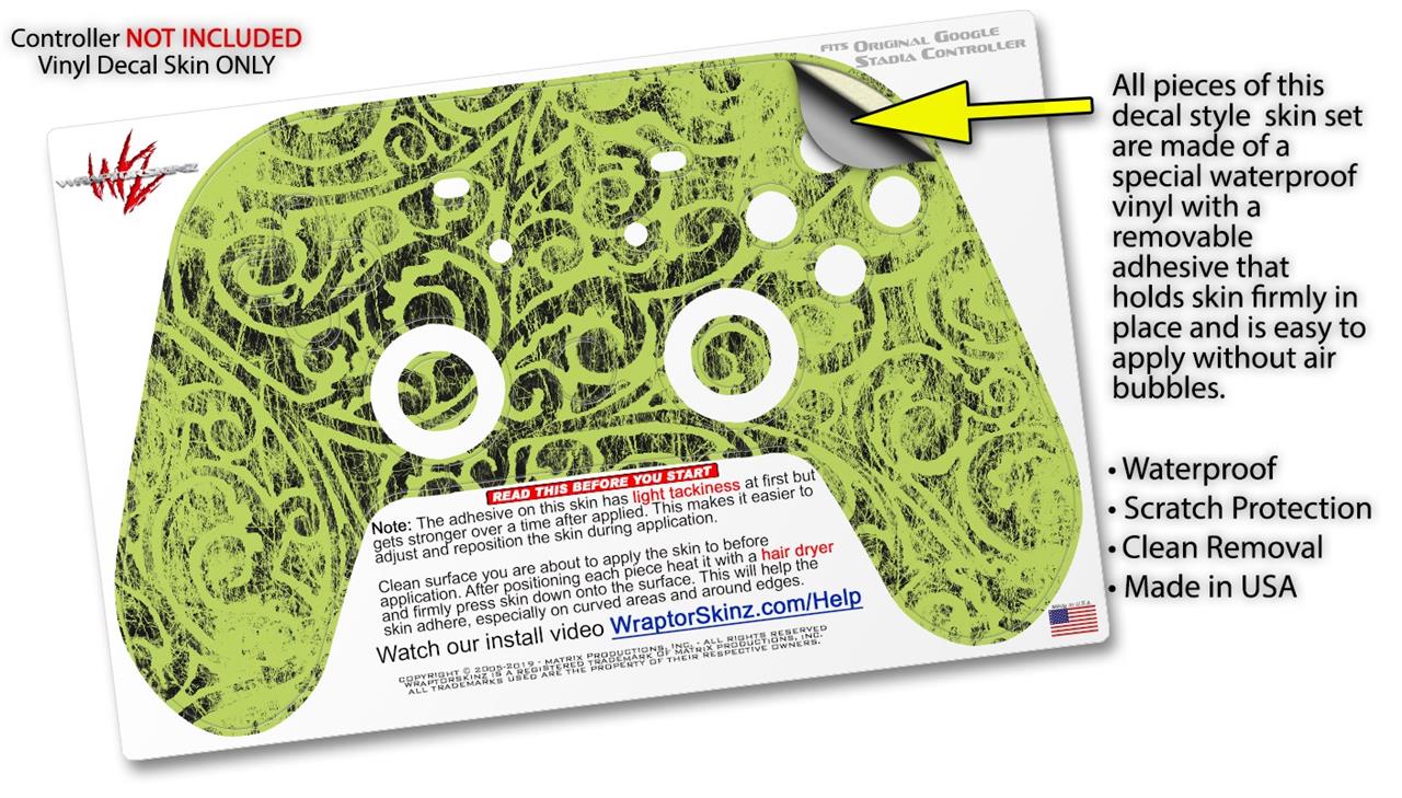 This product is in no way affiliated with or endorsed by Google. WraptorSkinz® skin wraps work with the Original Google Stadia version 1 Controller. Printed using superb photo quality designs and vibrant colors printed with special fade resistant inks that last even in direct sun for years. WraptorSkinz are a composite of two layers of commercial grade materials. The bottom layer is a soft, flexible vinyl with a special removable adhesive that is easily positioned, applied without air bubbles. Next, we print the bottom layer with UV protected, fade resistant inks that deliver superb photo quality designs in vibrant colors. Finally, we bond a professional grade laminate over the entire skin adding a glossy protective finish.
