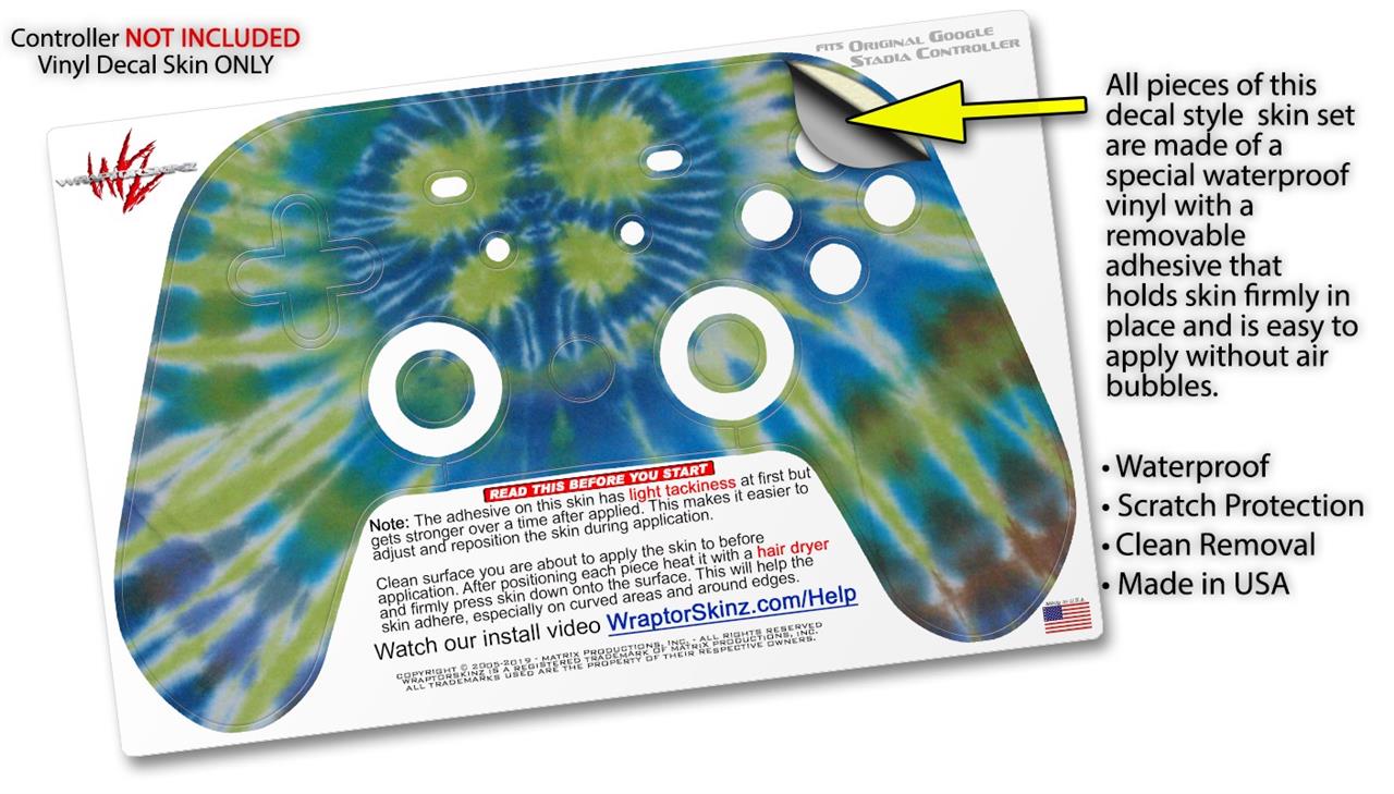 This product is in no way affiliated with or endorsed by Google. WraptorSkinz® skin wraps work with the Original Google Stadia version 1 Controller. Printed using superb photo quality designs and vibrant colors printed with special fade resistant inks that last even in direct sun for years. WraptorSkinz are a composite of two layers of commercial grade materials. The bottom layer is a soft, flexible vinyl with a special removable adhesive that is easily positioned, applied without air bubbles. Next, we print the bottom layer with UV protected, fade resistant inks that deliver superb photo quality designs in vibrant colors. Finally, we bond a professional grade laminate over the entire skin adding a glossy protective finish.