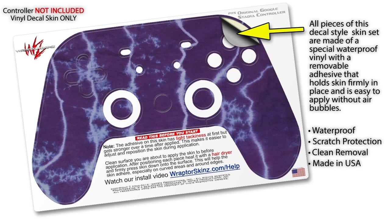 This product is in no way affiliated with or endorsed by Google. WraptorSkinz® skin wraps work with the Original Google Stadia version 1 Controller. Printed using superb photo quality designs and vibrant colors printed with special fade resistant inks that last even in direct sun for years. WraptorSkinz are a composite of two layers of commercial grade materials. The bottom layer is a soft, flexible vinyl with a special removable adhesive that is easily positioned, applied without air bubbles. Next, we print the bottom layer with UV protected, fade resistant inks that deliver superb photo quality designs in vibrant colors. Finally, we bond a professional grade laminate over the entire skin adding a glossy protective finish.