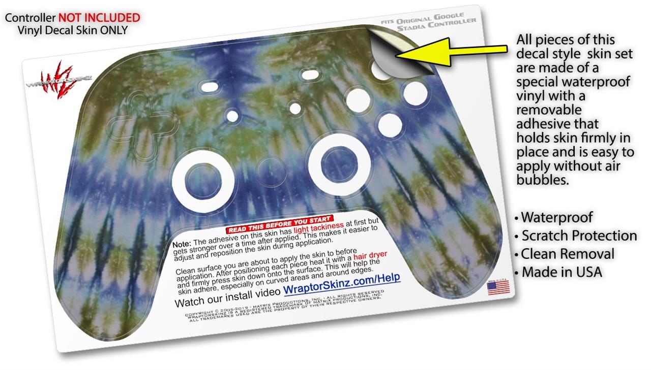 This product is in no way affiliated with or endorsed by Google. WraptorSkinz® skin wraps work with the Original Google Stadia version 1 Controller. Printed using superb photo quality designs and vibrant colors printed with special fade resistant inks that last even in direct sun for years. WraptorSkinz are a composite of two layers of commercial grade materials. The bottom layer is a soft, flexible vinyl with a special removable adhesive that is easily positioned, applied without air bubbles. Next, we print the bottom layer with UV protected, fade resistant inks that deliver superb photo quality designs in vibrant colors. Finally, we bond a professional grade laminate over the entire skin adding a glossy protective finish.