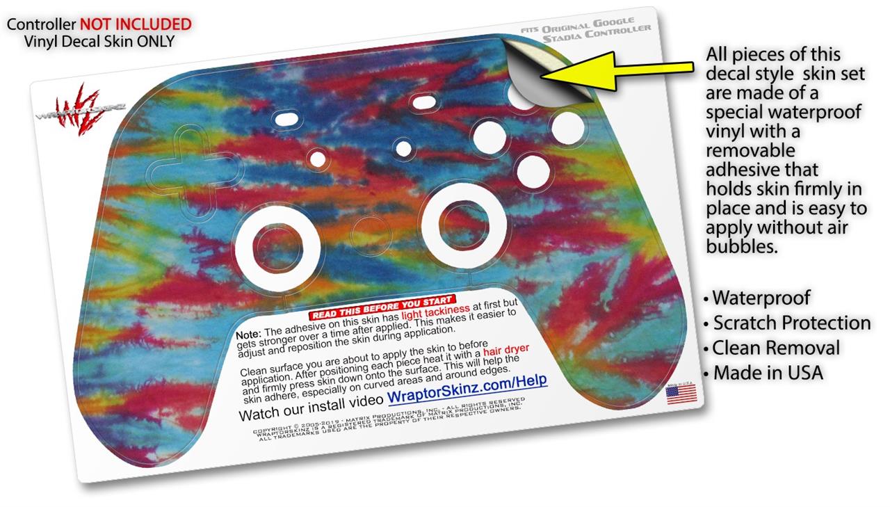 This product is in no way affiliated with or endorsed by Google. WraptorSkinz® skin wraps work with the Original Google Stadia version 1 Controller. Printed using superb photo quality designs and vibrant colors printed with special fade resistant inks that last even in direct sun for years. WraptorSkinz are a composite of two layers of commercial grade materials. The bottom layer is a soft, flexible vinyl with a special removable adhesive that is easily positioned, applied without air bubbles. Next, we print the bottom layer with UV protected, fade resistant inks that deliver superb photo quality designs in vibrant colors. Finally, we bond a professional grade laminate over the entire skin adding a glossy protective finish.