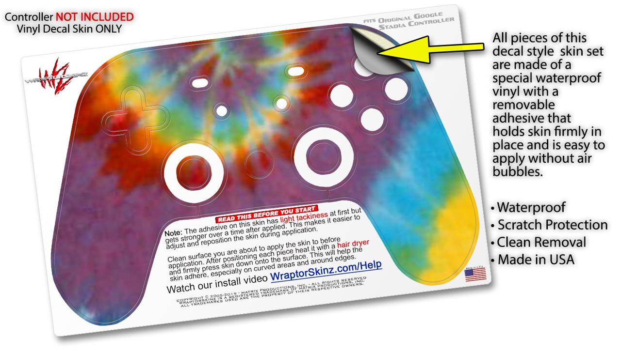 This product is in no way affiliated with or endorsed by Google. WraptorSkinz® skin wraps work with the Original Google Stadia version 1 Controller. Printed using superb photo quality designs and vibrant colors printed with special fade resistant inks that last even in direct sun for years. WraptorSkinz are a composite of two layers of commercial grade materials. The bottom layer is a soft, flexible vinyl with a special removable adhesive that is easily positioned, applied without air bubbles. Next, we print the bottom layer with UV protected, fade resistant inks that deliver superb photo quality designs in vibrant colors. Finally, we bond a professional grade laminate over the entire skin adding a glossy protective finish.