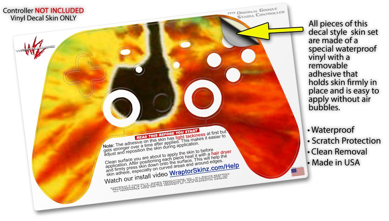 This product is in no way affiliated with or endorsed by Google. WraptorSkinz® skin wraps work with the Original Google Stadia version 1 Controller. Printed using superb photo quality designs and vibrant colors printed with special fade resistant inks that last even in direct sun for years. WraptorSkinz are a composite of two layers of commercial grade materials. The bottom layer is a soft, flexible vinyl with a special removable adhesive that is easily positioned, applied without air bubbles. Next, we print the bottom layer with UV protected, fade resistant inks that deliver superb photo quality designs in vibrant colors. Finally, we bond a professional grade laminate over the entire skin adding a glossy protective finish.
