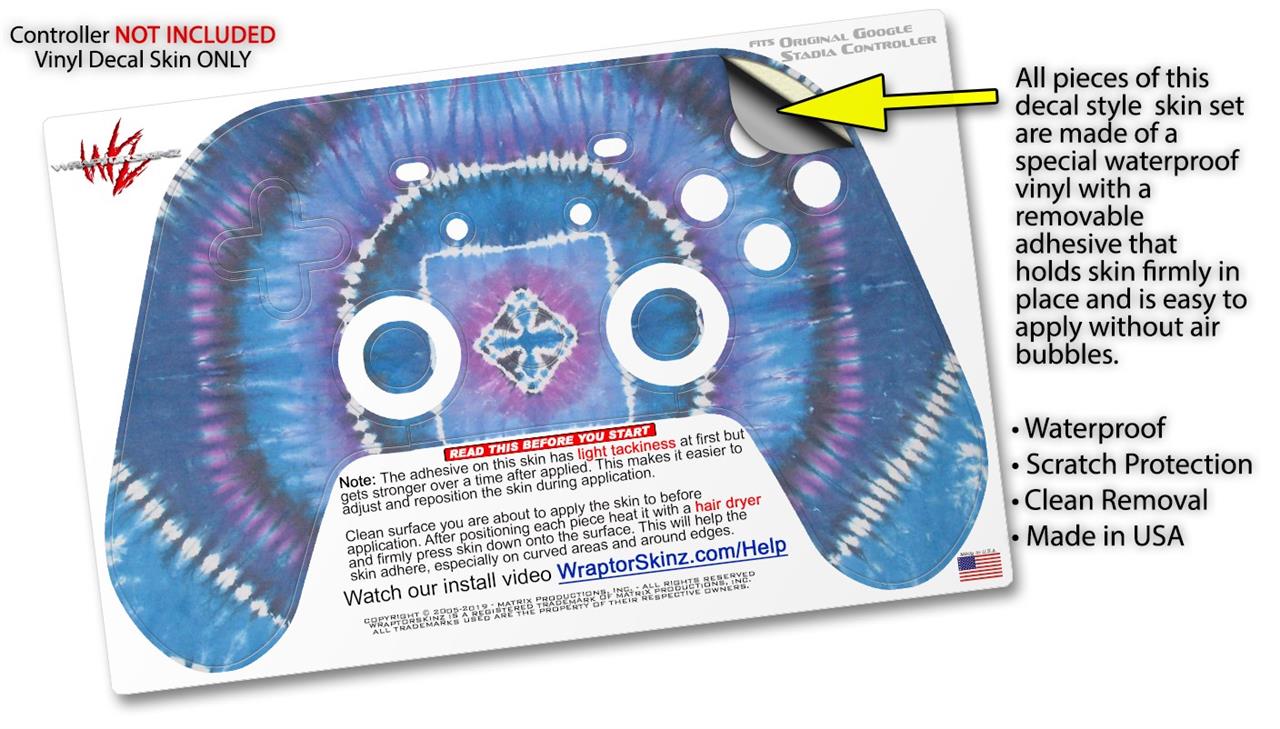 This product is in no way affiliated with or endorsed by Google. WraptorSkinz® skin wraps work with the Original Google Stadia version 1 Controller. Printed using superb photo quality designs and vibrant colors printed with special fade resistant inks that last even in direct sun for years. WraptorSkinz are a composite of two layers of commercial grade materials. The bottom layer is a soft, flexible vinyl with a special removable adhesive that is easily positioned, applied without air bubbles. Next, we print the bottom layer with UV protected, fade resistant inks that deliver superb photo quality designs in vibrant colors. Finally, we bond a professional grade laminate over the entire skin adding a glossy protective finish.