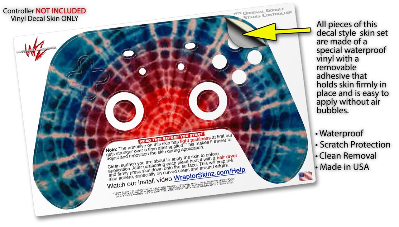 This product is in no way affiliated with or endorsed by Google. WraptorSkinz® skin wraps work with the Original Google Stadia version 1 Controller. Printed using superb photo quality designs and vibrant colors printed with special fade resistant inks that last even in direct sun for years. WraptorSkinz are a composite of two layers of commercial grade materials. The bottom layer is a soft, flexible vinyl with a special removable adhesive that is easily positioned, applied without air bubbles. Next, we print the bottom layer with UV protected, fade resistant inks that deliver superb photo quality designs in vibrant colors. Finally, we bond a professional grade laminate over the entire skin adding a glossy protective finish.