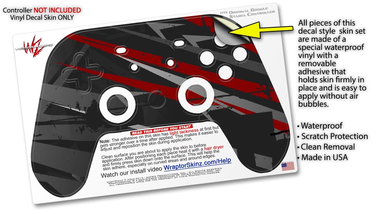 This product is in no way affiliated with or endorsed by Google. WraptorSkinz® skin wraps work with the Original Google Stadia version 1 Controller. Printed using superb photo quality designs and vibrant colors printed with special fade resistant inks that last even in direct sun for years. WraptorSkinz are a composite of two layers of commercial grade materials. The bottom layer is a soft, flexible vinyl with a special removable adhesive that is easily positioned, applied without air bubbles. Next, we print the bottom layer with UV protected, fade resistant inks that deliver superb photo quality designs in vibrant colors. Finally, we bond a professional grade laminate over the entire skin adding a glossy protective finish.