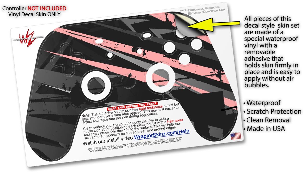 This product is in no way affiliated with or endorsed by Google. WraptorSkinz® skin wraps work with the Original Google Stadia version 1 Controller. Printed using superb photo quality designs and vibrant colors printed with special fade resistant inks that last even in direct sun for years. WraptorSkinz are a composite of two layers of commercial grade materials. The bottom layer is a soft, flexible vinyl with a special removable adhesive that is easily positioned, applied without air bubbles. Next, we print the bottom layer with UV protected, fade resistant inks that deliver superb photo quality designs in vibrant colors. Finally, we bond a professional grade laminate over the entire skin adding a glossy protective finish.