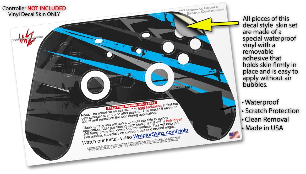 This product is in no way affiliated with or endorsed by Google. WraptorSkinz® skin wraps work with the Original Google Stadia version 1 Controller. Printed using superb photo quality designs and vibrant colors printed with special fade resistant inks that last even in direct sun for years. WraptorSkinz are a composite of two layers of commercial grade materials. The bottom layer is a soft, flexible vinyl with a special removable adhesive that is easily positioned, applied without air bubbles. Next, we print the bottom layer with UV protected, fade resistant inks that deliver superb photo quality designs in vibrant colors. Finally, we bond a professional grade laminate over the entire skin adding a glossy protective finish.