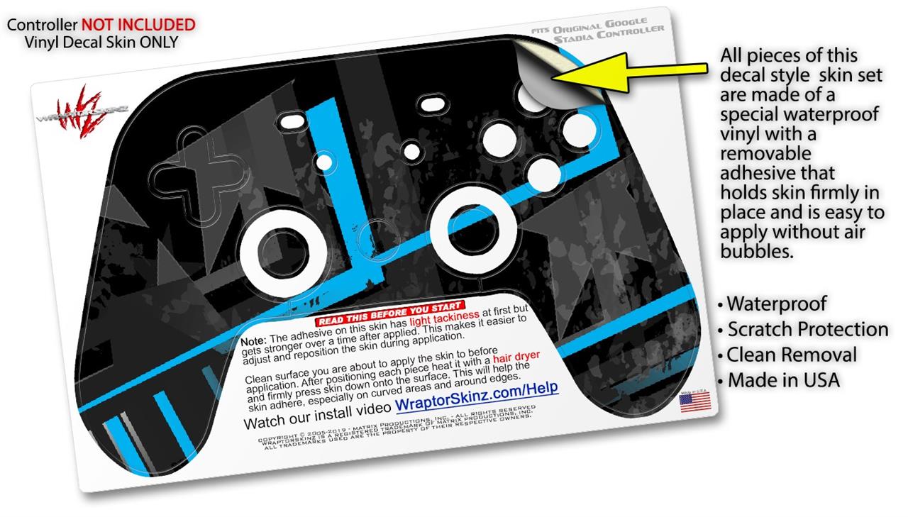 This product is in no way affiliated with or endorsed by Google. WraptorSkinz® skin wraps work with the Original Google Stadia version 1 Controller. Printed using superb photo quality designs and vibrant colors printed with special fade resistant inks that last even in direct sun for years. WraptorSkinz are a composite of two layers of commercial grade materials. The bottom layer is a soft, flexible vinyl with a special removable adhesive that is easily positioned, applied without air bubbles. Next, we print the bottom layer with UV protected, fade resistant inks that deliver superb photo quality designs in vibrant colors. Finally, we bond a professional grade laminate over the entire skin adding a glossy protective finish.