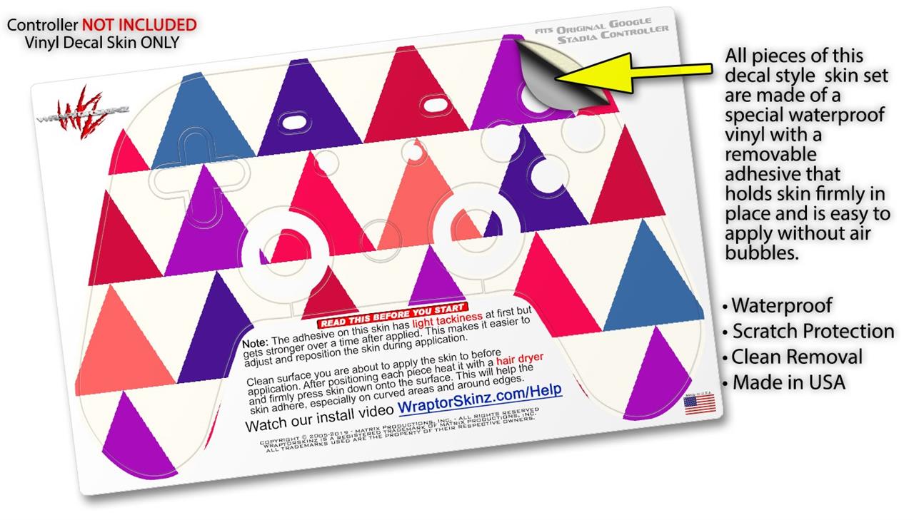 This product is in no way affiliated with or endorsed by Google. WraptorSkinz® skin wraps work with the Original Google Stadia version 1 Controller. Printed using superb photo quality designs and vibrant colors printed with special fade resistant inks that last even in direct sun for years. WraptorSkinz are a composite of two layers of commercial grade materials. The bottom layer is a soft, flexible vinyl with a special removable adhesive that is easily positioned, applied without air bubbles. Next, we print the bottom layer with UV protected, fade resistant inks that deliver superb photo quality designs in vibrant colors. Finally, we bond a professional grade laminate over the entire skin adding a glossy protective finish.