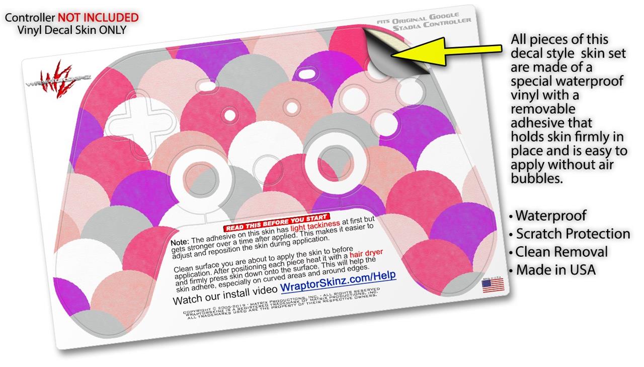 This product is in no way affiliated with or endorsed by Google. WraptorSkinz® skin wraps work with the Original Google Stadia version 1 Controller. Printed using superb photo quality designs and vibrant colors printed with special fade resistant inks that last even in direct sun for years. WraptorSkinz are a composite of two layers of commercial grade materials. The bottom layer is a soft, flexible vinyl with a special removable adhesive that is easily positioned, applied without air bubbles. Next, we print the bottom layer with UV protected, fade resistant inks that deliver superb photo quality designs in vibrant colors. Finally, we bond a professional grade laminate over the entire skin adding a glossy protective finish.