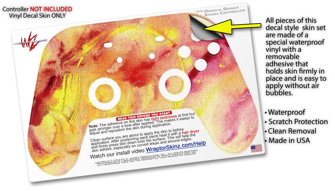 This product is in no way affiliated with or endorsed by Google. WraptorSkinz® skin wraps work with the Original Google Stadia version 1 Controller. Printed using superb photo quality designs and vibrant colors printed with special fade resistant inks that last even in direct sun for years. WraptorSkinz are a composite of two layers of commercial grade materials. The bottom layer is a soft, flexible vinyl with a special removable adhesive that is easily positioned, applied without air bubbles. Next, we print the bottom layer with UV protected, fade resistant inks that deliver superb photo quality designs in vibrant colors. Finally, we bond a professional grade laminate over the entire skin adding a glossy protective finish.